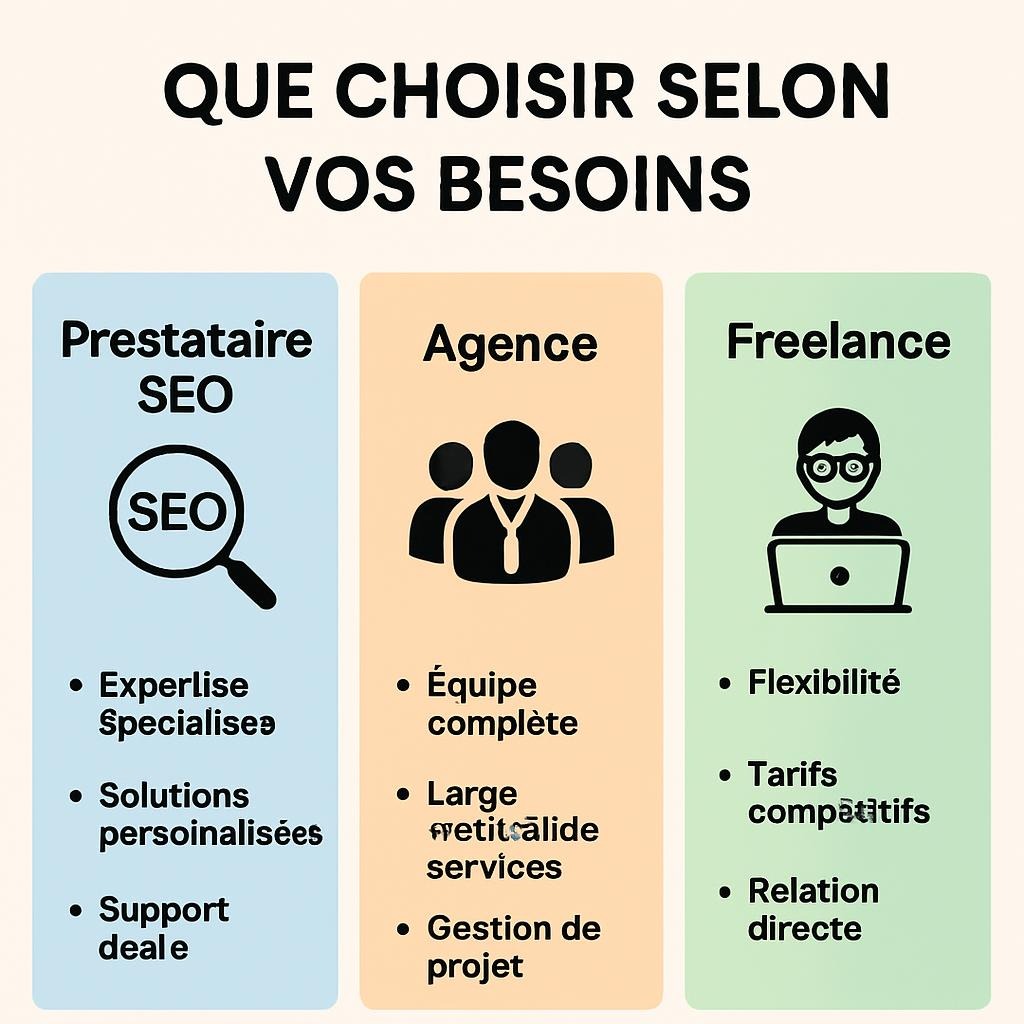 | Critères | Freelance | Agence SEO | Prestataire indépendant |